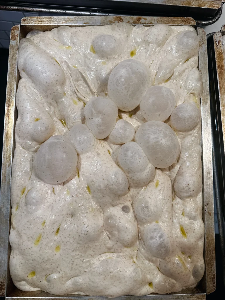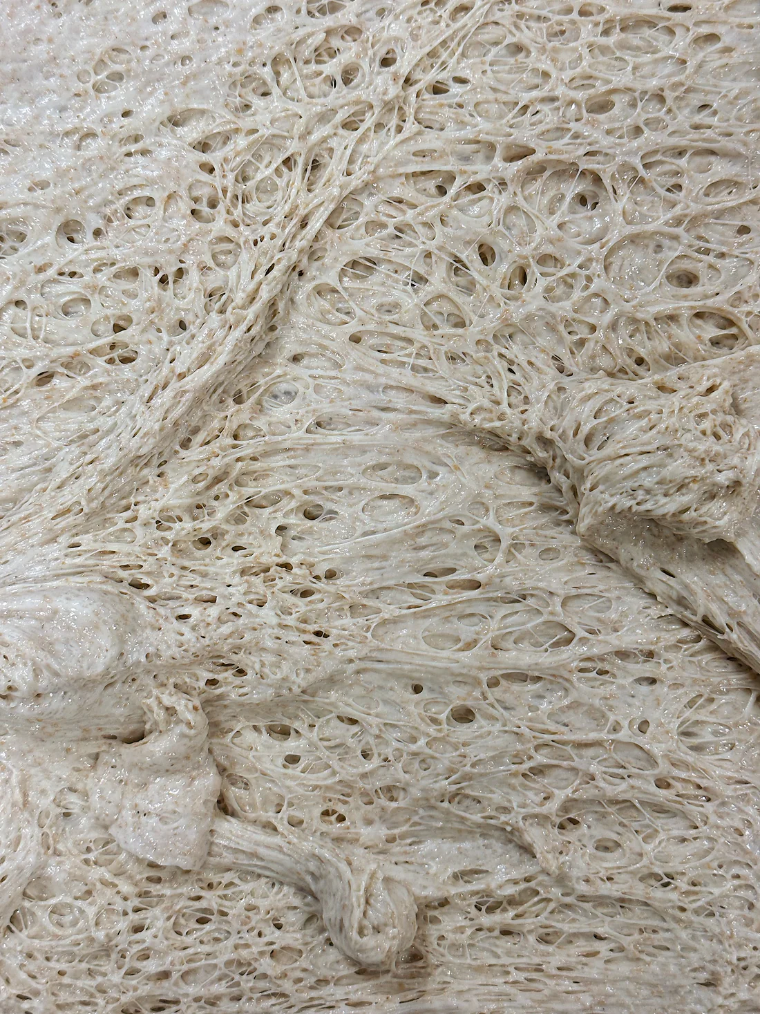 Per un impasto più idratato, utilizzo invece la tecnica dello “slap and fold”, ovvero faccio cadere l’impasto sul piano di lavoro energicamente, e intanto lo piego su se stesso.